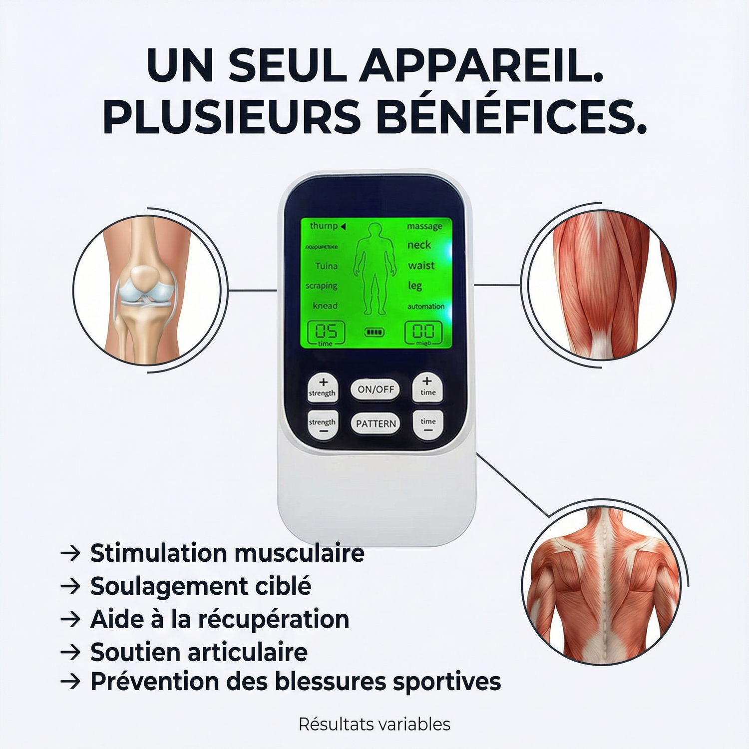 Ce stimulateur musculaire TENS & EMS agit directement sur les zones ciblées pour soulager la douleur, détendre les muscles et accélérer la récupération, sans médicament ni contrainte.